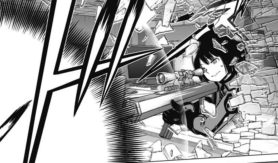しかし、雨取の狙撃は鉛弾(レッドバレット)ではなく通常弾で、辻を直撃し緊急脱出(ベイルアウト)させることに成功します。辻が狙撃された事を気にして、二宮は辻の方に注意を払いますが、その隙を狙って三雲は二宮に対して攻撃します。
