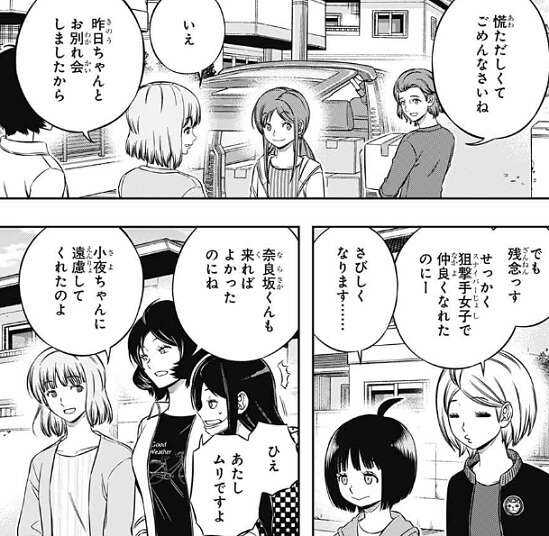 わたしもずっと那須隊ですから!またメールしますね~~!と言いながら夏目は引っ越していき、那須隊と雨取、夏目は車で去っていく日浦を見送ります。