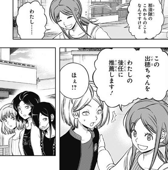 日浦から、出穂ちゃんは絶対強くなりますよ!当真先輩もそう言ってたし、と夏目を推しますが、夏目本人はただのC級っすよ!?と遠慮します。しかし、日浦から意見を聞かれた雨取も夏目に出来ると思うと言い、他の那須隊も夏目を歓迎します。夏目も照れながら、B級に上がれたらお願いします、と言い夏目は那須隊に内定します。