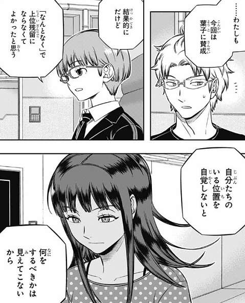 オペレーターの染井も今回は香取に賛成で、なんとなくで上位残留にならなくてよかったと思う、自分達のいる位置を自覚しないと、何をすべきかは見えてこないから、と染井は若村と三浦に言います。
