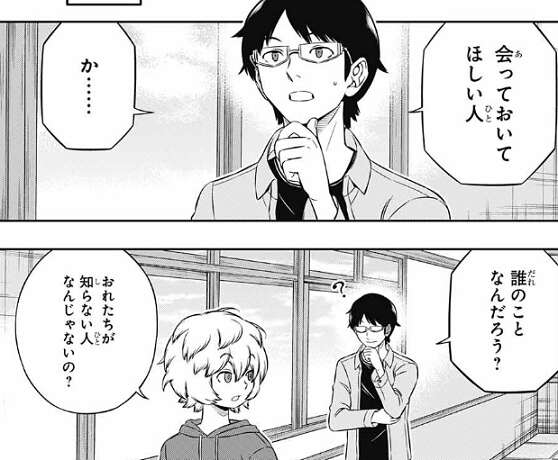 そこに迅が現れて瑠花はもう来てるか、三雲に聞いてきます。三雲は、迅が『会わせたい人』とは、瑠花のことだったのか質問すると、ちがうよと迅から返事がきます。『会わせたい人』には、今から会いに行くから三雲は普段着のままトリオン体に換装しといて、と三雲に言います。