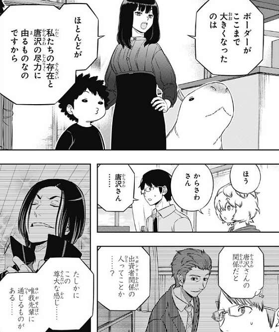 自分の事を説明していない林藤支部長に呆れる瑠花は、三雲と空閑に自分と陽太郎への敬意を忘れないように言います。瑠花に言わせると、ボーダーがここまで大きくなったのは、ほとんどが私達の存在と、唐沢の尽力に由るものという事だそうです。三雲はその態度、その尊大な感じから、唯我に通じるものがあると感じます。忍田本部長と本部長補佐の沢村は、瑠花を林藤支部長に任せた後、自動車で帰っていきます。