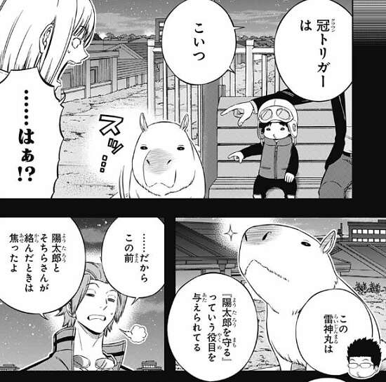 今回さらに、母(マザー)トリガーを動かしているのは瑠花で、さらに冠(クラウン)トリガーというのがあり、なんと雷神丸がそれだそうです。レギーとヒューズと陽太郎が絡んだ時、展開次第で三門市は火の海になっていたそうです。雷神丸、ただのメスのカピバラじゃ、なかったんですね。それにしては、雷神丸は陽太郎を舐めているような気が…。