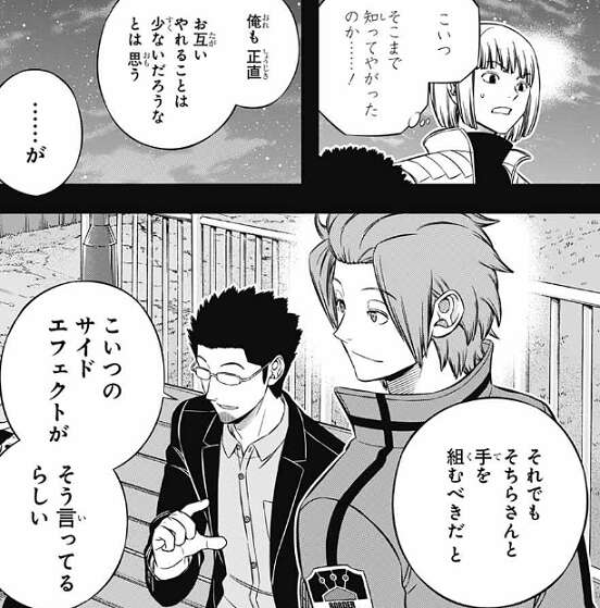 その点に関しては、我々を信用していただくしかありませんね、とラタが言うと、三雲もウソはついていないと判断します。今の話は忘れてください、と三雲は言い、『ボーダー』玉狛支部と、ガロプラ遠征部隊の同盟締結が決定します。