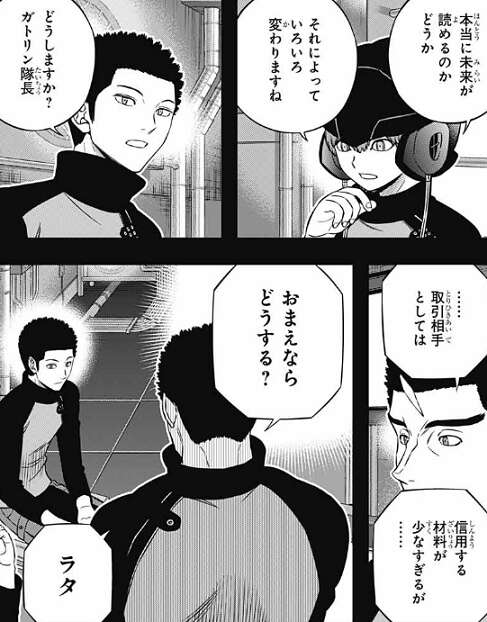 場面が変わり、迅と三雲と空閑が待ち合わせ場所に到着すると、ラタとレギーが待っています。お互い自己紹介をした後、ラタは迅達に取引については条件をのむことにしました、とアフトクラトルの属国のデータを渡します。