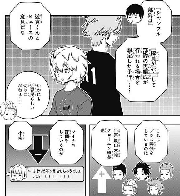 他の評価が集まった意見では、『シャフルチームは』『隊員が死亡して部隊の再編成が行われた場合を想定した予行』があり、空閑とヒュースが意見を出しています。この意見にプラス評価をしているのは、当真、嵐山、木崎、クローニンチーフ、迅で、小南がマイナス評価をしています。小南は、まわりがドン引きしちゃうでしょう、バカ!!!と、怒ってマイナス評価にしたようです。