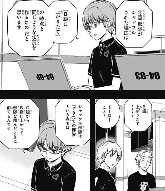 リアルタイムで見ていた根付が、特に染井の意見が興味深かったと録画していました。その録画が見ると染井が、『B級に上がりたて』の時点と同じような状況を作るため、だと思います、と意見を言っています。シャフルチームは『できたてのチーム』という点では、C級からB級に上がってチームを組んだ時と似ている、と染井は言い、一方でチーム組んでから経験はそれぞれが積んでいるとも言います。