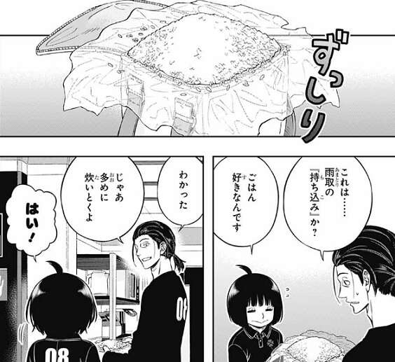 二宮8番隊は夕食の準備に取り掛かっていて、東が炒め物と米とスープを作ろうとしています。そこに雨取が、ごはん好きなんです、と東にご飯を炊いて欲しいと『持ち込み』の米を出します。東は、わかった、じゃあ多めに炊いとくよ、と言うと、雨取は嬉しそうに、はい!と、答えます。