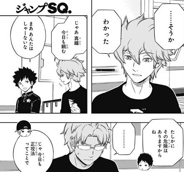 三雲は自分のミスだと謙遜しますが、トラブルはデカくなる前に対処するのが大事なんだよ、と諏訪は言います。がっつり揉めてから解決すんのは、ぱっと見すげえ活躍してるように見えっけど、審査側からしたら、『トラブった』っつうマイナス印象の方がたぶんでけーからな、と諏訪は三雲にアドバイスします。そして、手に負えないと思った時は早めに自分に振れ、と諏訪はアドバイスし、二人とも就寝します。