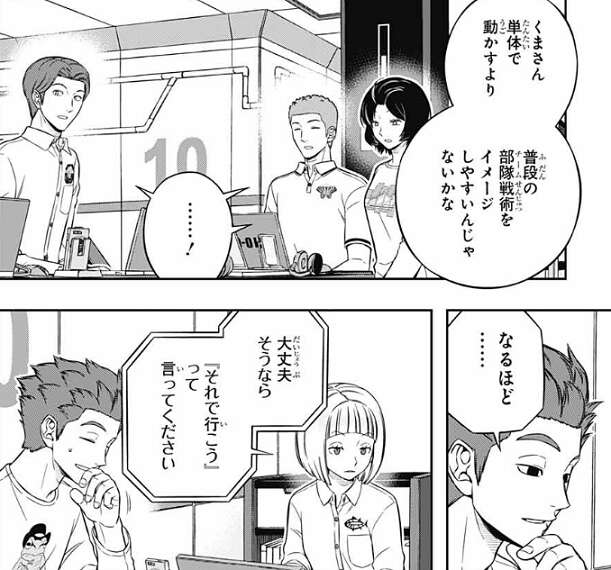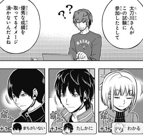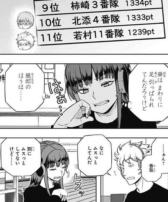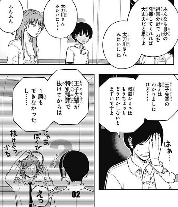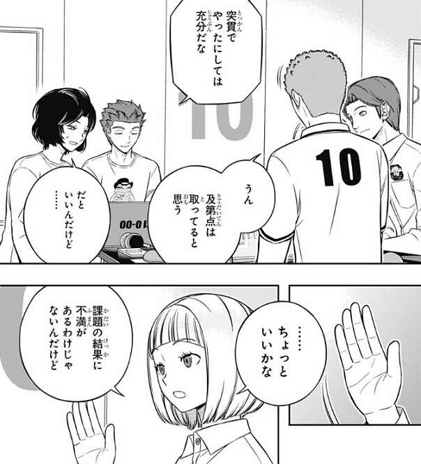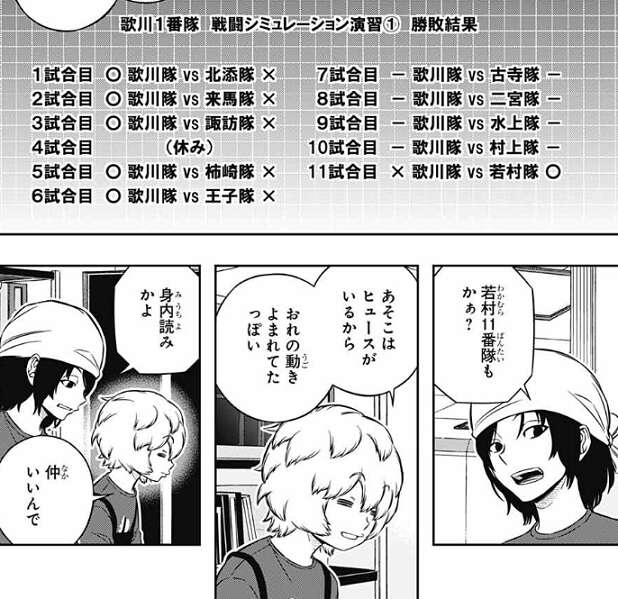 しかし辻が、生駒はもっとできる人だと思う……、と言うと、生駒はショックからすぐに立ち直ります。帯島が王子にどう考えてるんですか?と、意見を聞くと、おもしろさ優先でこのチームを組んだから、現状には十分満足していると言います。試験の全部でいい点を取る必要はないと思う、上層部もそう思っているはずだし、と王子は言い、例として遠征部隊常連の太刀川がこの試験に参加したとしても、優秀な成績を取ってるイメージは湧かない、と王子は皆に話します。この意見には審査をしてるA級の小南、烏丸、三輪も同意します。