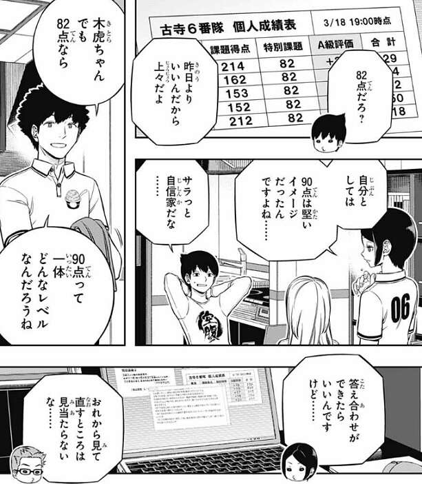 古寺6番隊は、木虎の特別課題の解答を古寺がチェックしています。特別課題の得点は82点で奥寺は上々だと言いますが、木虎としては90点は固いイメージだったようで、どこか直すところが無いかを気にしているようです。