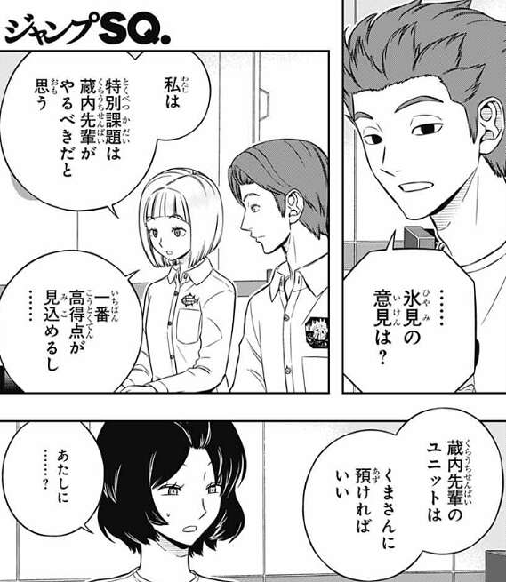 氷見は明日、同じような特別課題が来た場合どうするのか、今決めた方がいい、と意見を言うと、村上にだけ『氷見の意見は?』……って訊いてください、と話しかけます。村上がその通り氷見に聞くと、特別課題は蔵内がやるべきだと思うと言います。そして、蔵内のユニットは熊谷が操作すればいい、蔵内は足が速くて合成弾持ちだから、那須と似た感じで動かせるはず、と熊谷に言います。