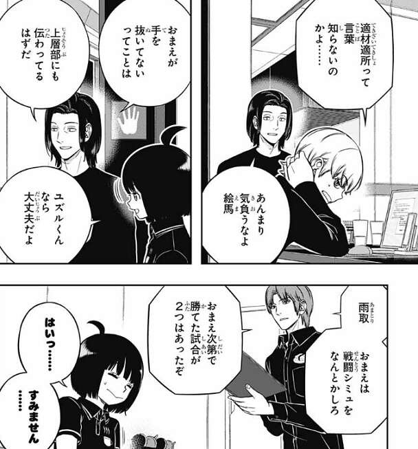 絵馬は、適材適所って言葉を知らないのかよ……、と不満をつぶやきますが、東はあんまり気負うなよ、と絵馬を気遣います。雨取も絵馬を励ましますが、二宮は雨取に対しても、おまえ次第で勝てた試合がふたつはあったぞ、と戦闘シミュをもっと改善するように催促します。