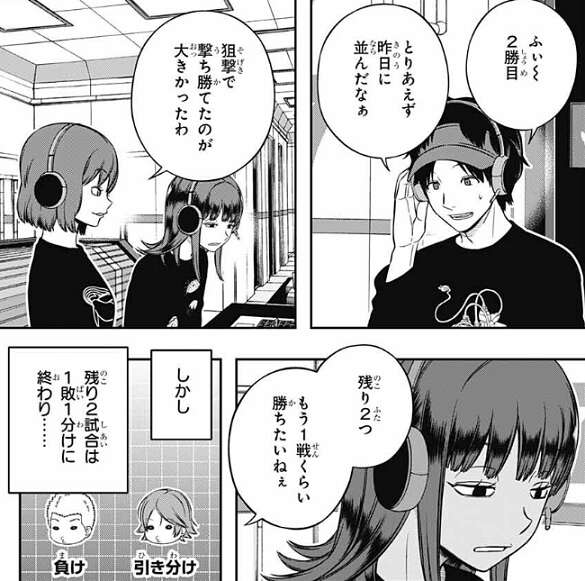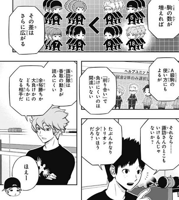 ヒュースは理屈の通った連携で攻めてくる相手、来馬隊、古寺隊、水上隊、村上隊あたりには引き分け以上にできると思う、と言います。理由としては、このチームの明確に有利な点としてほとんどのチームにトリオンの『総量』で優っている所を挙げ、駒の数が増えればその差はさらに広がる、とヒュースは言います。A級駒の使い方にもよるが、『削り合い』で負けにくいのは間違いない、とヒュースがさらにに言うと、それならトリオン量が少ない諏訪隊もいけるんじゃないか?と、笹森が言います。しかし、ヒュースは諏訪隊は香取の動きが読みにくく、余裕勝ちか大負けのどちらかになる相手だ、と答えます。