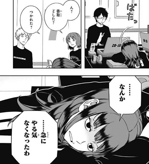 諏訪が明日に向けて、各自が気付いたことを聞こうとしますが、突然香取が机に突っ伏して寝てしまいます。宇井が香取に疲れた?と聞きますが、……なんか……急にやる気がなくなったわ、と香取は言い出します。香取の突然の発言にびっくりする隠岐と三雲ですが、こんな状態で戦闘シミュ3日目は大丈夫でしょうか?