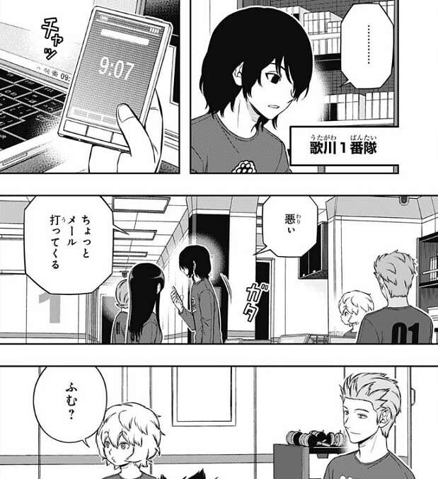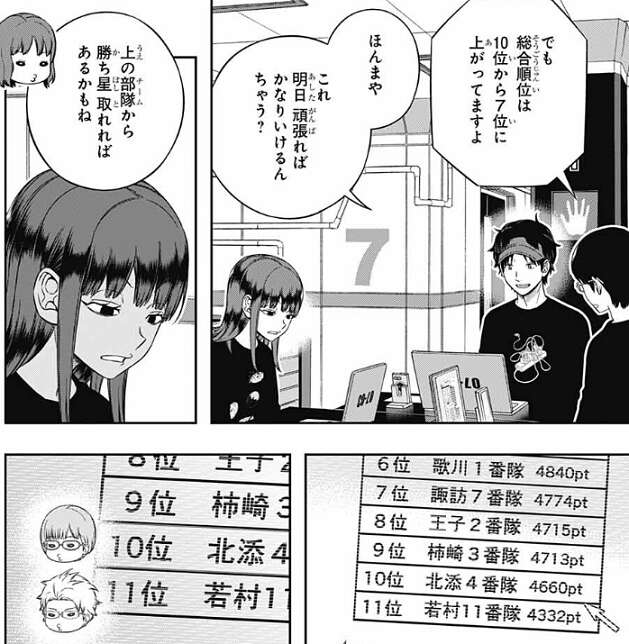 北添4番隊は、菊地原が事前に上層部の考えを予想していたようで、戦闘シミュをどうするかも菊地原が既に考えていたようです。今日特別課題が出たら、菊地原が担当するという事で北添も了解します。