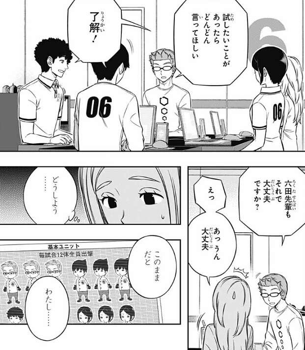 古寺6番隊は、操作するユニットの数が増えればトリオンが低い古寺隊は不利になる、という議論になります。トリオン値の数値がある程度関わってくるシールドや射撃でなく、ブレード主体で戦った方がいい、という話になりますが、古寺はそれでは水上隊に追いつけないし、二宮隊には追い抜かれる、と言います。結局、水上9番隊のメンバー相手に課題の処理速度で追いつくのは難しいので、戦闘シミュで点を稼いで1位を狙うという事になり、戦闘シミュ2日目は明日に繋がるデータを獲るため、色々試すという事で古寺が話をまとめます。しかし、オペレータの六田は何か心配事があるようで一人悩んでいますが、言い出せずそのまま話は進んでしまいます。