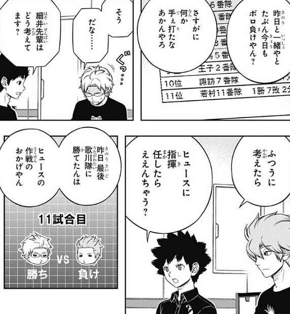 若村11番隊は、細井が駒の数とは別に考えないといけないことがある、と発言します。このままだと戦闘シミュ1日目と一緒で今日もボロ負けになる、さすがに何か手を打たないといけない、と細井は意見します。リーダーの若村は責任を感じていますが何も言えず、細井はヒュースに指揮を任せたらいい、と言います。戦闘シミュ1日目で唯一、勝てた歌川隊との戦闘はヒュースの作戦のおかげ、と細井は言います。