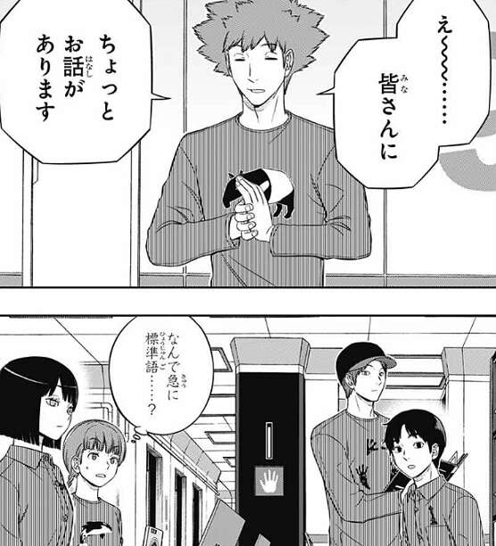 すると宇井が、んじゃ訊いとこ、と対戦相手の能力データで虫食いになっている所を開示し合おうと言います。全部のチームは大変ですが、上位チームの二宮隊と水上隊の能力データは共有したほうが捗ると思う、という事になり宇井と六田はお互いのデータを送り合います。さらに香取が持っている万能適正スキルの情報も交換します。適正系スキルはどれも微妙だと香取は言い、万能適正スキルも雑魚スキルだと、香取は断言します。