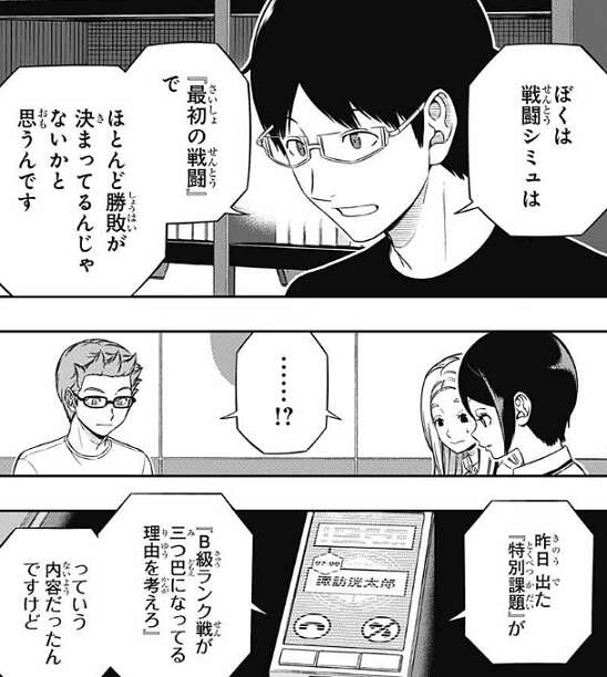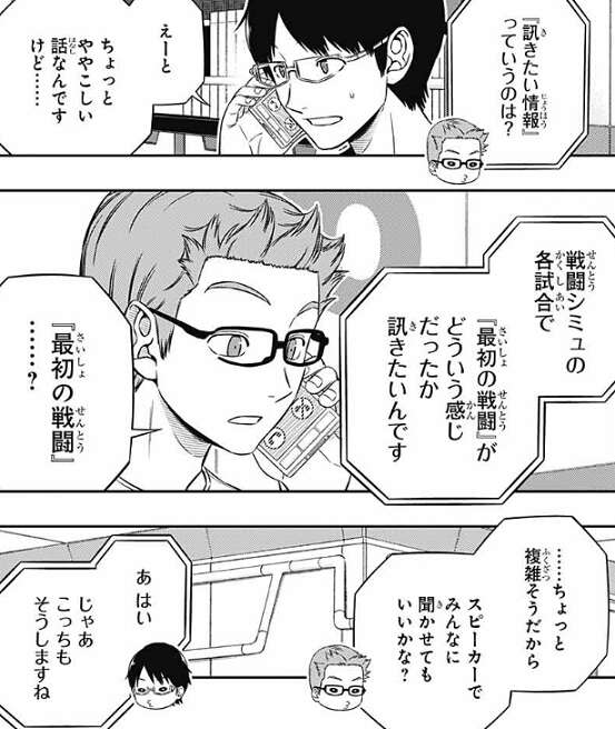 諏訪7番隊と古寺6番隊がネタ共有することになり、三雲は古寺に戦闘シミュの各試合の『最初の戦闘』がどういう感じだったかを訊こうとします。古寺は複雑な話になりそうなのでスピーカーにしてみんなに聞かせる状態にし、三雲もスピーカー状態にします。