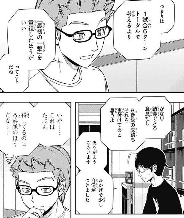 『最初の戦闘』とは『試合の中で最初にユニットがぶつかったターン』の事のようで、三雲は、『最初の戦闘』でほとんど勝敗が決まってるんじゃないかと思っている、と自分の考えを6番隊に話します。