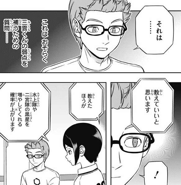 三雲の最後のネタとは、諏訪7番隊が他のチームと違って隊長が3人いることでした。諏訪隊の諏訪、香取隊の香取、玉狛第2の三雲、の隊長3人がいるという事ですが、三雲は順を追って最後のネタの説明をしていきます。三雲の考えでは、『最初の戦闘が一番重要』ですが、最初の戦闘でダメージ勝ちするには連携がきれいに決まるかどうかに大きく左右され、それについての1つの正解は水上隊が既に出している、と三雲は考えを話します。