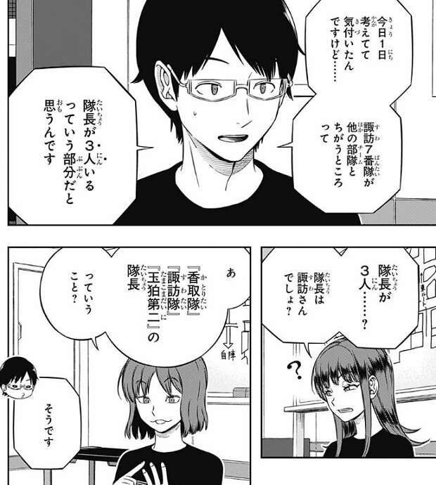 それを聞き諏訪が、諏訪7番隊の中に、諏訪隊の諏訪、香取隊の香取、玉狛第2の三雲で3つの『ミニ水上隊』を作る、という三雲の結論を代弁します。