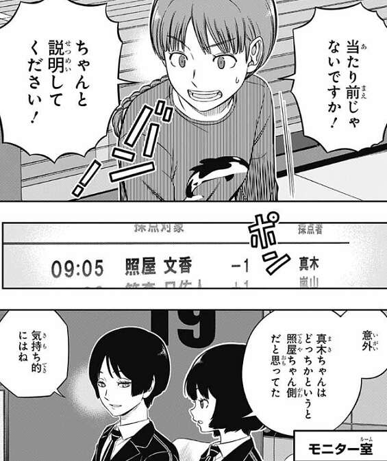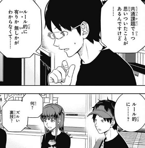 一方、諏訪7番隊の三雲は共通課題で一つ、思いついたことがあるようで、諏訪にその話をしようとします。しかし、ルール的に有りか、無しか、が三雲には分からないようで、迷っている様子を見せます。
