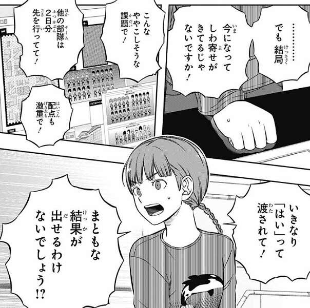 それでも樫尾は王子隊でなれているのか、ルールの確認からでしょうか?と、戦闘シミュに取り組もうとし、荒船もソフトのダウンロードからだな、と指示しますが、照屋は納得できずに、色々おかしいと言い、戦闘シミュに取り組む気になりません。