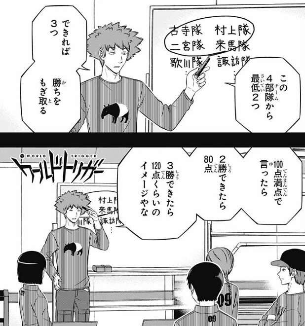 また、今は上位から獲る1勝の方が価値が高い、と荒船が意見を言うと、それが第2の理由だと水上は荒船の意見に付け加えます。下位チームが全勝しても村上9番隊が抜かれないだけの貯金があるが、上位チームのどこかが全勝して追い抜かれる方が怖い、と水上は第2の理由に説明を付け加えます。