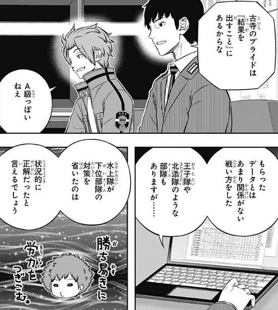 こうして戦闘シミュ前の説明が終わり場面は運営本部デスクへ戻り、水上9番隊の成績は10位で2勝7敗1引き分け、440点でした。水上の予告した通り2勝していますが、真木辺りが、詭弁だね、と言いそうな内容だ、と鬼怒田がつぶやいています。しかし、水上の戦略は上位4チームに絞った対策だけでなく、前の日に下位の何チームかに宛てて上位チームのユニット情報を流していたそうです。隊員に無茶な要求をする一方で、別のルートからも手を打っていた、と城戸は評価しているようです。こういう人材がいると楽なのではないのかね?と、城戸が忍田に質問しますが、時と場合による、渋い顔で答えます。どうやら林藤の事が頭をよぎったようです。