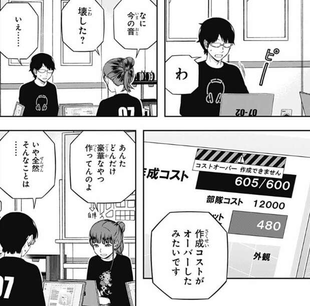 さらに漆間に言われて、空閑は対策の案も出します。空閑は対策に関して、しなくていいと思うんだよなあ、と言います。ここで、巴に試合が始まってレーダーに敵が12体映っていた場合の、1体のコストがどれくらいかという問題を出します。単純に考えれば、チームコストが12,000なので、1体1,000ぐらいとなる、と巴は答えます。20体くらい映っていたら?と、空閑に続けて質問されて、その場合は1体600前後、と巴は答えます。しかし漆間が、コストが超安いダミーユニットを混ぜれば、もっと強いユニットも数が出せる可能性を指摘します。