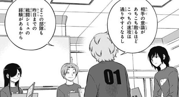 一方、歌川1番隊は「対策しない」という割り切った空閑の意見を採用し、速攻戦術の方針でトリオン兵を作り始めます。歌川1番隊が一歩リードしているように見えますが、他のチームはどのように進めているでしょうか?どのような展開になるか、239話が待ち遠しいです。