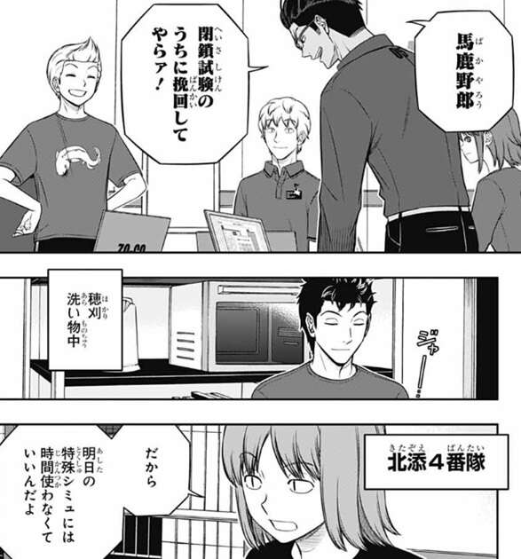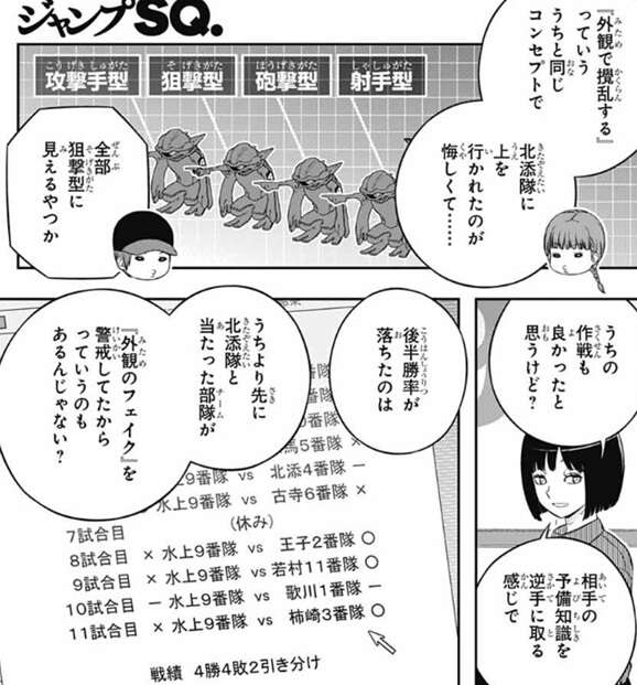 場面は来馬5番隊に移り、全体的に対応型のチームが苦戦していると来馬が分析しています。来馬隊も対応型の戦術の為に成績が振るわず、総合順位を8位に落としていて、単日11位、特殊シミュ11位と苦戦しています。来馬は作戦が中途半端なのが良くなく、隊長のぼくの判断ミスだと言い、弓場にそんなに落ち込む必要はないとフォローします。弓場は落ち込んでいないと言いつつ、トリオン兵の作り方について色々教えてくれた小荒井に申し訳ないと謝ります。しかし、小荒井は全然大丈夫だと言い、戦闘では弓場さんがチームを助けてくれるっしょ?と、弓場を元気づけます。