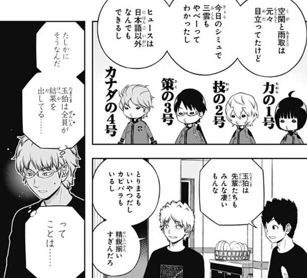 そして、半崎と笹森は玉狛支部のメンバーもすごいと言い、空閑と雨取はもともと目立っていたけど、今日のシミュで三雲がすごいと分かったし、ヒュースは日本語以外何でもできるし、と玉狛第2支部を全員褒めます。さらに、玉狛は先輩たちもみんな凄いし、鳥丸もいい奴だし、カピバラもいるし、と精鋭揃いすぎんだろ、と玉狛を絶賛します。玉狛は全員が結果を出しているという事実から、若村は玉狛支部には何か隊員を強くする秘密があるんじゃないか?と推測しますが、ヒュースに即座に否定されます。