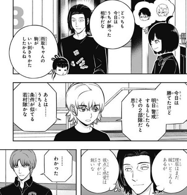三雲以外は今晩から分担課題を、明日に引きずらない程度に残業で取り組んでいく事になります。一方、総合順位が7位に下がり単日8位だった二宮隊8番隊は、明日の特殊シミュの作戦会議をしています。総合順位は7位に下がりましたが、絵馬は今日の特殊シミュの試合は悪くなかったとメンバーに話します。加賀美の派手なユニットのおかげで、逆に雨取のユニットが相手の印象に残ったので、明日の敵チームは多分雨取のユニットを近づけないように、射程が長いユニットを増やしてくるんじゃないかと絵馬は予想します。