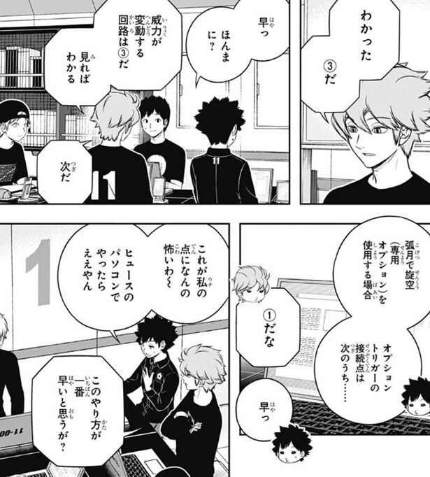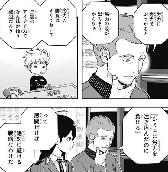 さらに三雲はジャミングの小ネタも用意していました。ジャミングは最大までポイントを振っても効果が2ターン分しか続きませんが、1・2ターン目をジャミングするユニットと、2・3ターン目をジャミングするユニットがいれば切れ目なくジャミングが続けられるので、ジャミングのリレーを行おうという作戦です。昨日諏訪隊に負けたチームは、1・2ターン目の伏兵に警戒すると三雲は予想しますが、さらにもう1ターンユニットを伏せれば有利に戦えると三雲は考え、昨日の経験を逆手に取るこの作戦を考えたそうです。三雲の省エネ作戦を聞き、諏訪はこれだけネタがあれば十分と判断、特殊戦闘シミュ2日目は肩の力抜いてサクッとやんぞ、と全員に指示を出します。