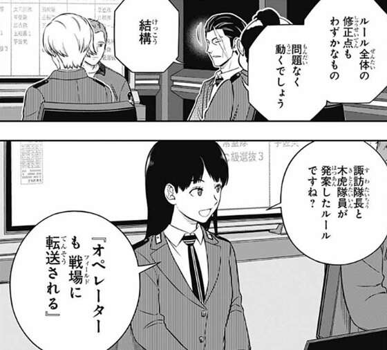 議題は次の長時間戦闘試験に移り、鬼怒田は『追加ルール』のテストは終わっていて問題なく動くでしょうと城戸に報告します。その『追加ルール』とは、諏訪と木虎が考案した『オペレーターも戦場(フィールド)に転送される』というルールのようです。おそらく3/24からの長時間戦闘試験では、オペレーターもフィールドに転送されるルールが追加されるのだと思います。