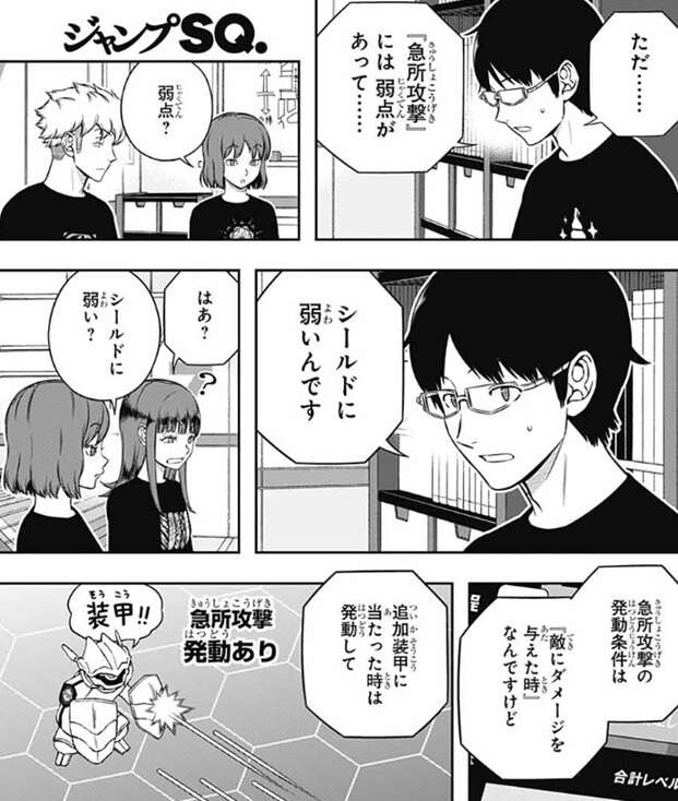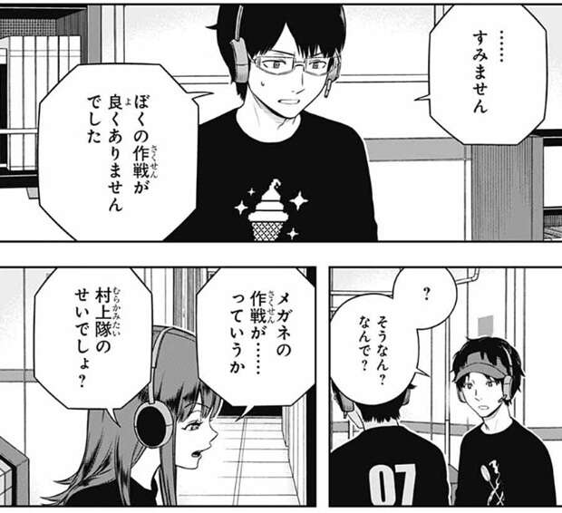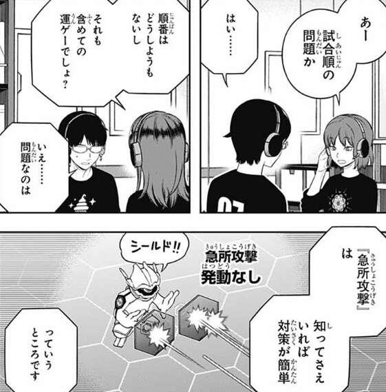 村上隊と先に当たったチームが、『急所攻撃』対策でシールドを使うようになったからうちが勝てなくなった、と香取は試合順の問題だと言い、順番はどうしようもない、それも含めての運ゲーだと言います。しかし三雲は、『急所攻撃』は知ってさえいれば対策が簡単な作戦、というところが問題だと言います。ネタが被ることを見越して、もっと対策しにくい戦術を選ぶべきだった……、と三雲は凹みますが、まだ1試合残っているので凹むのは終わってからでいい、と諏訪は言います。