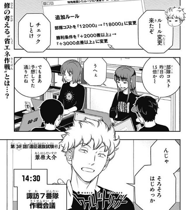 特殊戦闘シミュ2日目のルール変更が届き、部隊コストが1.5倍(12,000→18,000)に、勝利条件が『+2000差以上』→『+3000点差以上』に変更されることが判明します。ただ、諏訪7番隊では予想していた内容だったようで、全員に驚きはありません。そして、諏訪が三雲に特殊戦闘シミュ2日目の作戦内容を聞くと、三雲は深呼吸をした後に省エネ作戦の内容を説明し始めます。