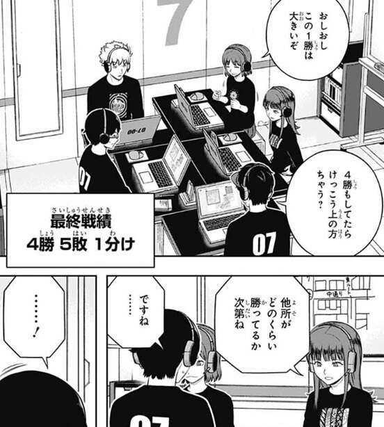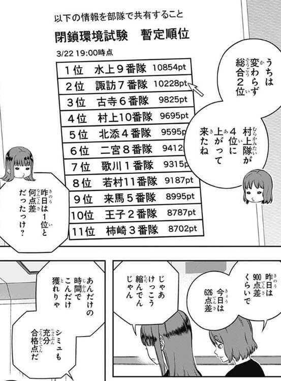 桐山も、今までみたいな短期の遠征ではなく今度の遠征はかなり長いので、ずっと艇の中では精神的に参ってしまうと沢村の意見を支持します。最終的に色々試したい部分もあり、思う所もあるだろうが了承してもらいたい、と城戸から言われると、根付もこの追加ルールを受け入れます。最後の『特別課題』に関して今日は予定通り実施する確認をしたところで、6試合目の結果が出ます。諏訪隊は6試合目まで終わって、3勝1敗1分けと高い勝率で折り返しとなっていました。