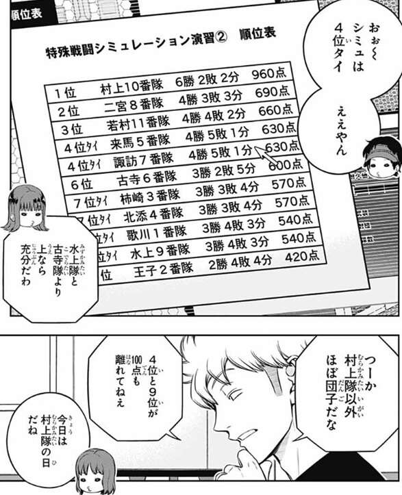 そして総合順位は変わらず2位、今日好調だった村上隊が4位に上がって来ています。昨日に比べて水上隊との点差は約900点差から、626点差に縮まっているので1位も狙えそうです。諏訪も、あれだけの時間でこれだけ獲れりゃ、シミュも十分合格点だ、と三雲を褒めて三雲もホッと一安心します。