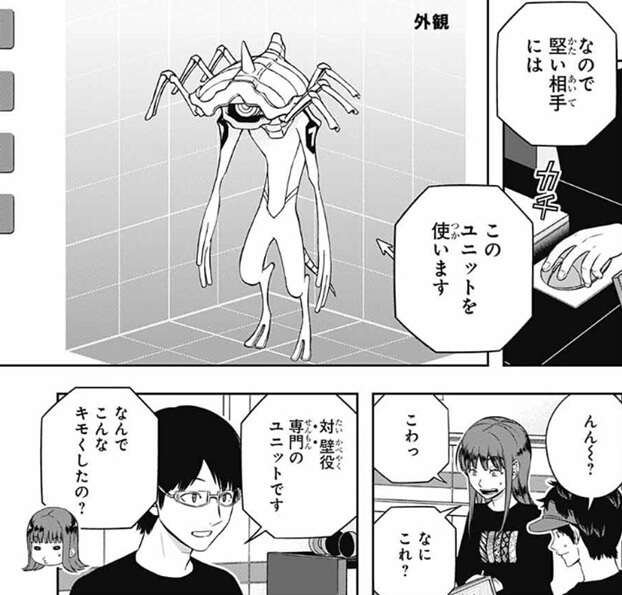 三雲はどのチームもある程度狙撃や射撃の対策をしてくると予想し、その場合諏訪隊が困るのが防御に特化したユニットを盾にされて、狙撃を正面から受けられる事だと説明します。その場合、切り詰めた弾数を固い相手に吸われて、狙撃ユニットは弾が足らなくなり狙撃ユニットが何も出来なくなる、と香取が三雲の考えを代弁します。ここで三雲は固い相手用に考えたユニットを見せますが、見た目はかなりキモいユニットです。三雲は対壁役専門のユニットだと説明し、見た目がキモいのは壁役をこっちに向けてくれた方が助かるから、見た目で警戒してもらおうとこんな外見にした、意図を説明します。ちょうど、特殊戦闘シミュ1日目に歌川1番隊や二宮隊8番隊がやった感じだね、と宇井が言います。