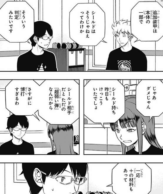 追加装甲は本体の一部だが、シールドは本体とは無関係だからそういう判定の様だと三雲は言います。香取は、昨日もシールド持ちは結構いたので、シールド相手だとただの『超弱い弾』だとさすがに博打過ぎる、と否定的ですが、一応プラスの材料もあり、追加装甲の特徴は安くて固くて使い捨て、シールドの特徴は味方をガード出来て割られてもまた張り直せる、というものですが、昨日の試合ではシールドは割られたらそのまま落ちる事が多くて、シールドを貼り直す場面はほとんど無かったそうです。どうせシールドを貼り直せないなら、今日の試合は安くて固い追加装甲を使うチームが増える、と三雲は予想しているそうです。