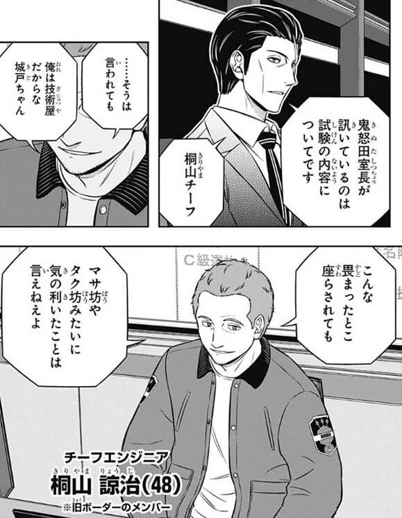 鬼怒田 から話を振られた桐山チーフという人物は、トリオン兵設計ツールがバグも無く動いていて結構と答えます。しかし、城戸から鬼怒田 が訊いているのは試験の内容についてです、と注意されますが、俺は技術屋だからマサ坊やタク坊みたいに気の効いたことは言えないと桐山は答えます。ちなみにマサ坊は忍田真史本部長の事で、タク坊とは林道匠玉狛支部支部長の事だそうです。この桐山諒治という人物はチーフエンジニアで、旧ボーダーのメンバーとの事なので城戸達とは古くからの知り合いのようです。さらに48歳で42歳の城戸よりも年上だから、こういう話し方になってしまうようです。忍田からさらに圧をかけられると、今日はこのまま村上隊がトップで行くんじゃないですか?と、桐山はやっと試験内容についてコメントします。
