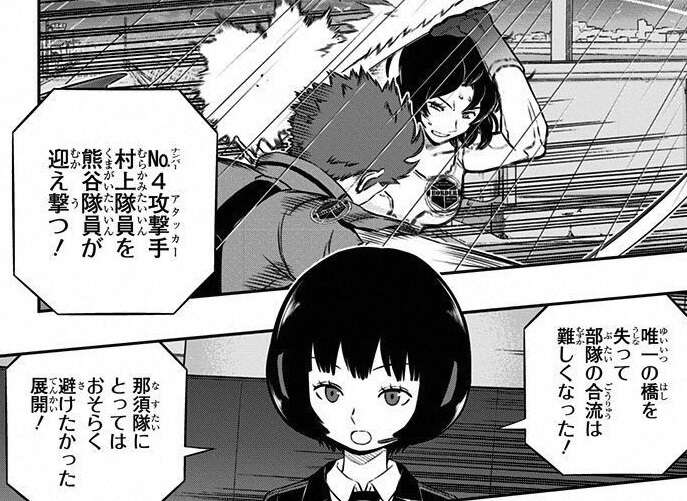 そしてB級ランク戦の第3戦が始まり、各チーム合流を優先しますが三雲は他のチームの合流を阻止するために、雨取の大砲で橋を破壊し合流させない作戦をとります。