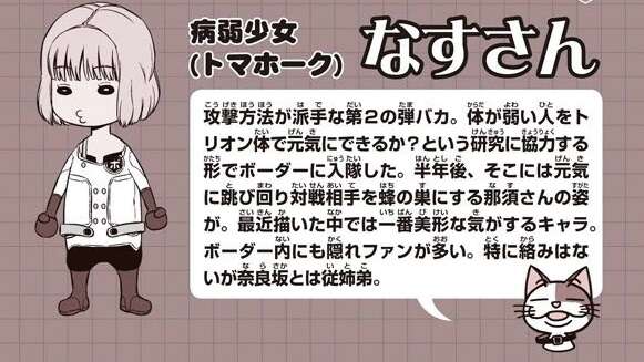 病弱少女、トマホーク、なすさんの作者説明です。体が弱い設定ですが、トリオン体なら元気になる可能性があるという事で、ボーダーに入隊しました。半年後、元気に対戦相手を蜂の巣にする那須さんの姿があったそうです。