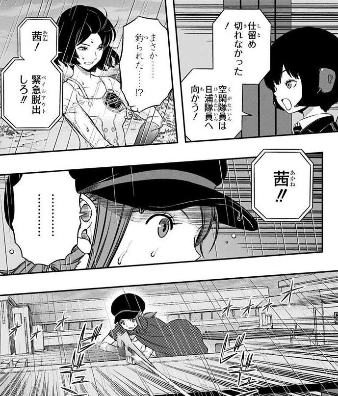 MAP東側での戦いが進むと、三雲の指示で雨取が堤防を破壊して川の水を住宅地に引き込む作戦をとります。