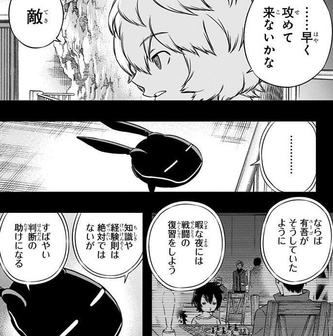 黒トリガーによって身体がトリオン製になっている空閑は眠る必要はありません。暇を持て余している空閑は有吾のマネをして、レプリカと戦闘の復習をします。