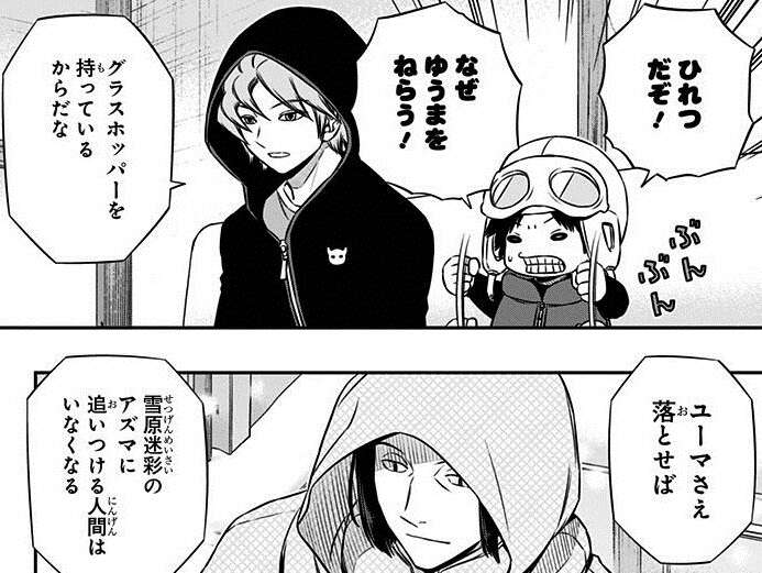 雨取と夏目が「通常狙撃訓練」を行っていると、次にB級ランク戦であたら影浦隊の絵馬ユズルと知り合います。絵馬から、師匠は鳩原だと聞き鳩原も人が撃てずに結局、上層部から遠征部隊に合格していたのに、それが原因で合格を取り消された事を聞きます。雨取は自分と同じ鳩原に共感しますが、絵馬に自分が人を撃てない事まで言ってしまいます。